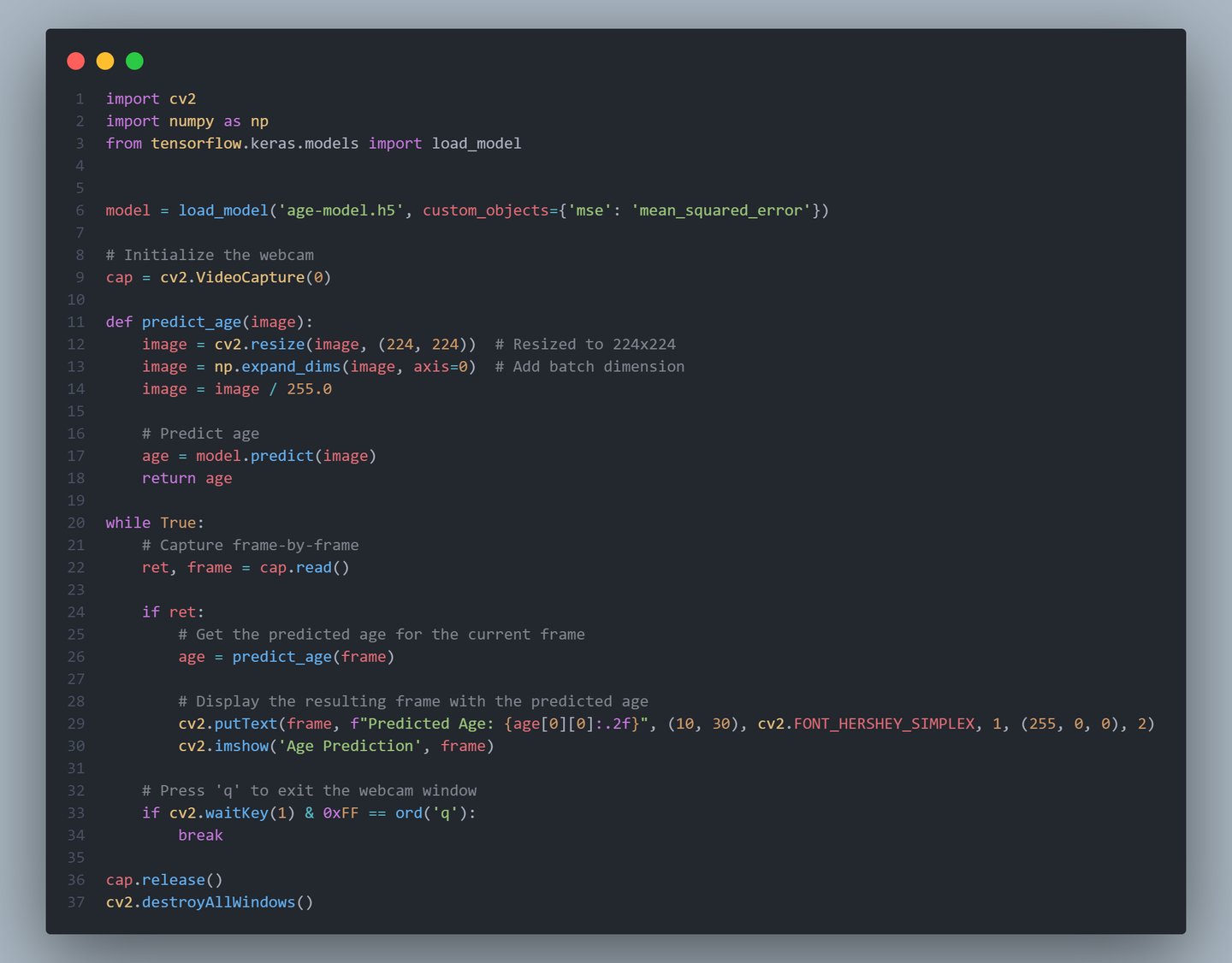 This program doesn't detect age exactly but can provide approximate age. I am 21 years old, and the program shows I am 22, so there is only small difference. This program begins by loading the pre-trained model, which is stored in a file named age-model.h5. The predict_age function is responsible for preprocessing the input image by resizing it to the expected dimensions (224x224 pixels), normalizing the pixel values, and passing it through the model to obtain an age prediction.