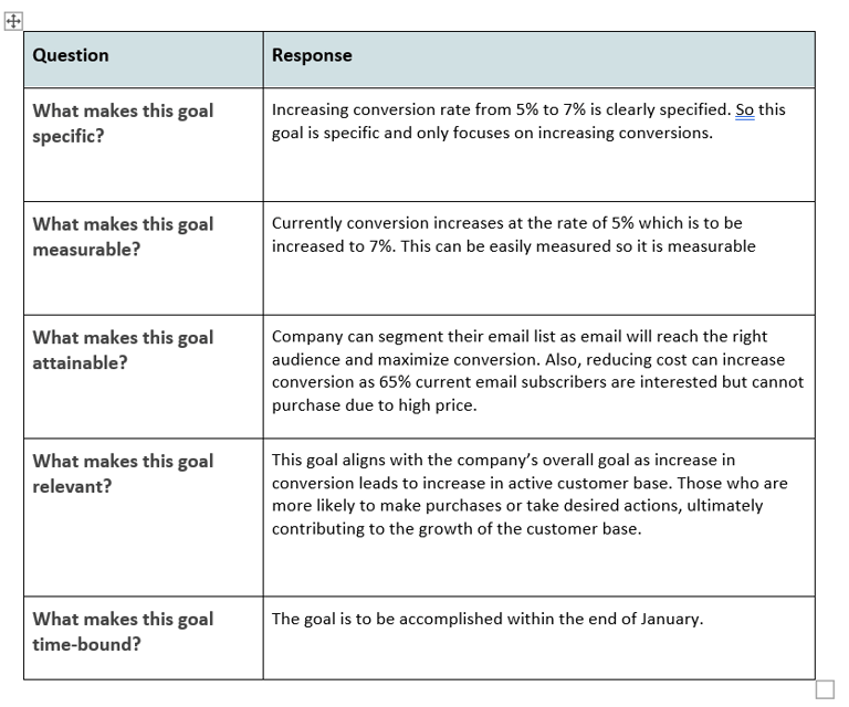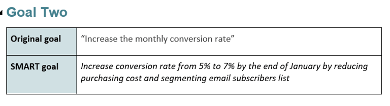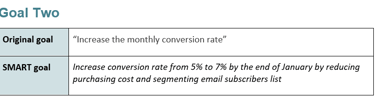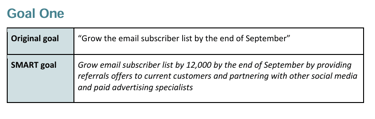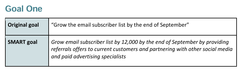 I was tasked to set two email marketing goals along with strategic SMART goals that aligns with overall business goal. The two marketing goals that I have established are: