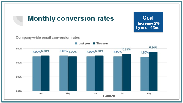 Summary: There is small increase in conversion rate after the lunch of our ‘For All’ line. In July, the conversion rate is 5.25% which increased to 5.50% in August. It seems like conversion rate is going to increase in upcoming months. If the conversion rate continues to grow only by 0.25% then it is expected to meet our goal by the end of January.