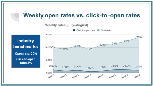 Summary: Open rate is performing very well against industry benchmark. It is concerning although open rates are high, click-to-open rates are below industry benchmark,