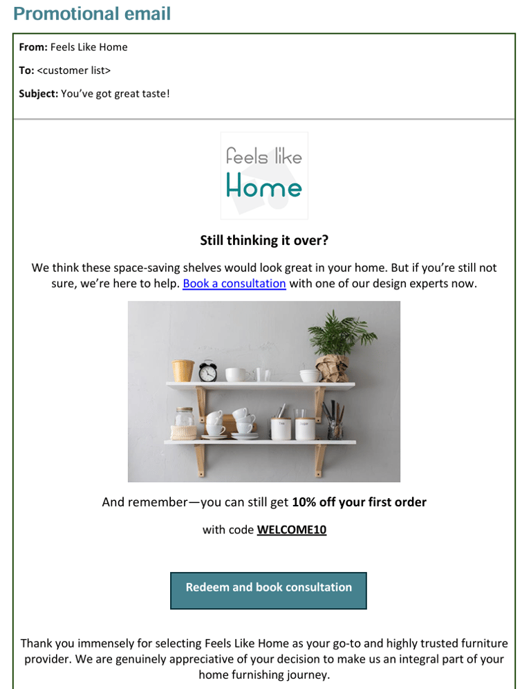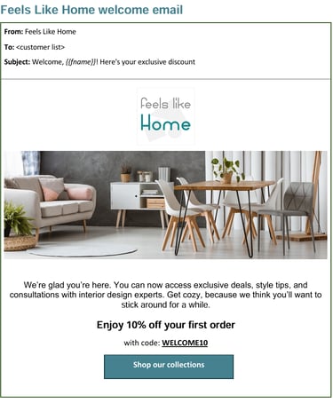 Here in the welcome email, I offered discounts with discount coupon for new customers who have recently joined Feels like Home.