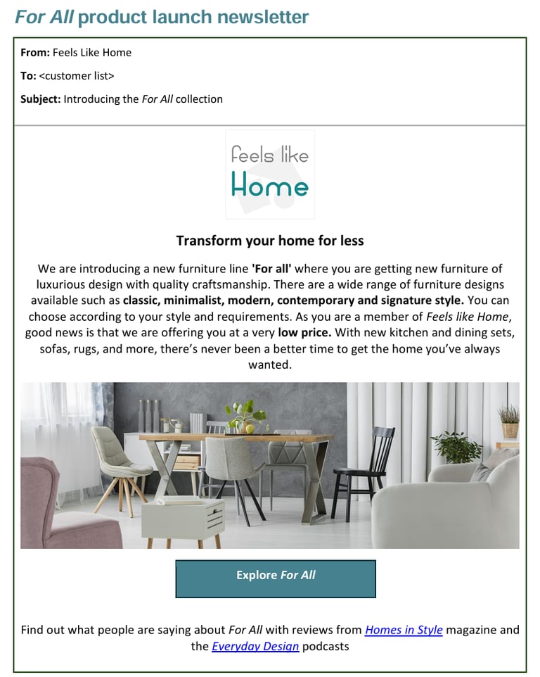 I worked as email marketer within the marketing team at Feels Like Home, an upscale furniture retailer that does most of its business offline, but the company has recently started to expand its online base through various marketing campaigns. For the shake of its online presence, the company decided to lunch new line of furniture called "FOR ALL". The "FOR ALL" line features the brand's high level of craftmanship, but at a lower price point then their previous offerings. Feels Like Home’s main business goal for the "FOR ALL" line was to grow their total active customer base by 30% within a year of launch. As a role of email marketer,