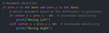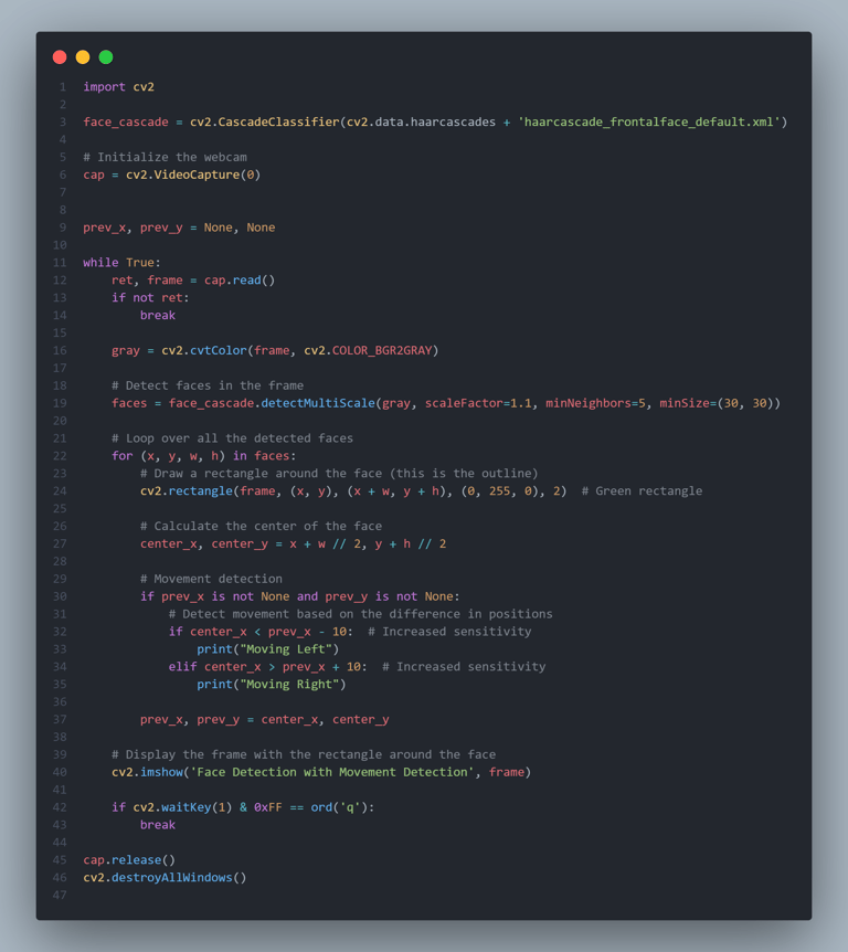 Motion detection is implemented here by analyzing the difference in the face's center position between consecutive frames.
