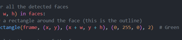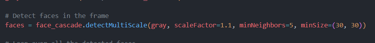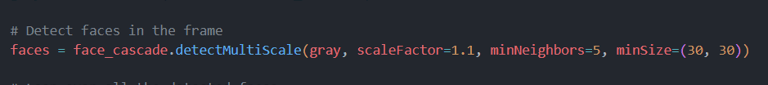 faces = face_cascade.detectMultiScale(gray, scaleFactor=1.1, minNeighbors=5, minSize=(30, 30))