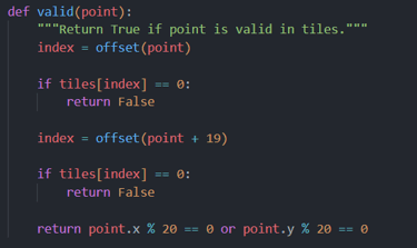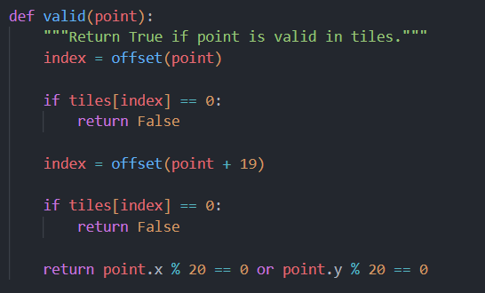 Pac-Man moves based on the aim direction, and the program validates if the movement is allowed using valid().