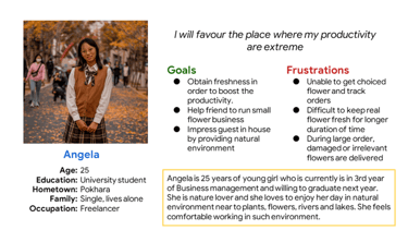 Angela is a freelancer and busy university student in business management who needs variety of flowers and plants because she want to boost her productivity in fresh environment