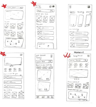 Stars were used to mark the element of each sketch that would be used in initial digital wireframe