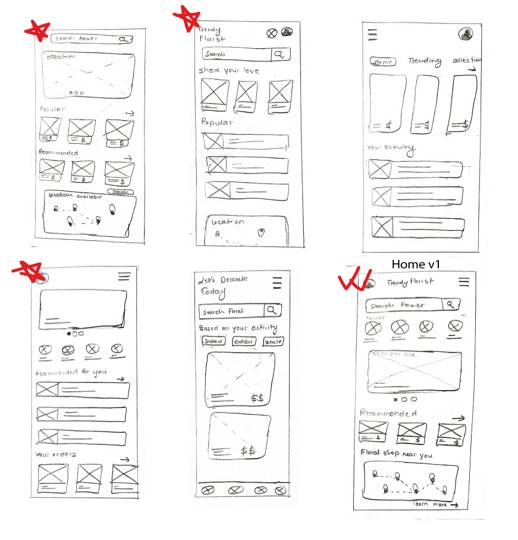 Taking the time to draft iterations of each screen of the app on paper ensured that made it to digital wireframe would be well suited to address user pain point. For the home screen, we prioritized user choice letting them to choose flowers